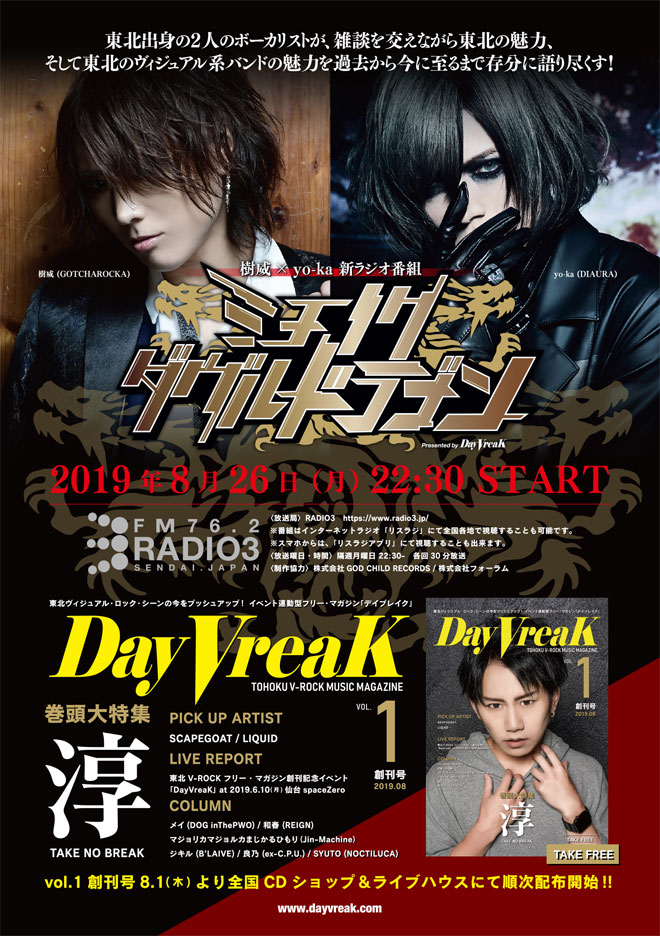 GOTCHAROCKAの樹威(Vo)とDIAURAのyo-ka(Vo)が、東北イベント連動型フリーマガジン『DayVreaK』とタッグを組み、新規ラジオ番組をスタートさせることが決定した。