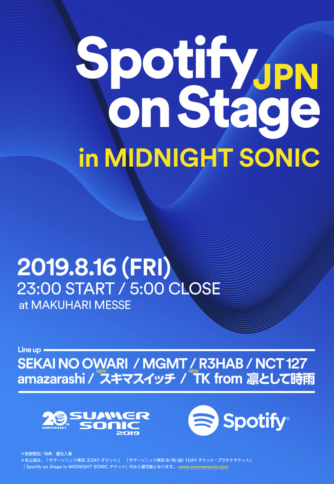 <Spotify on Stage in MIDNIGHT SONIC>は、音楽ストリーミング・サービスSpotifyとサマーソニック東京金曜深夜の<MIDNIGHT SONIC>のコラボレーションにより展開されるライブステージだ。今回の発表では、スキマスイッチとTK from 凛として時雨の出演が決定。第一弾として発表されたSEKAI NO OWARI、MGMT、R3HAB、NCT 127、amazarashiと合わせて、計7組の出演が明らかになった。