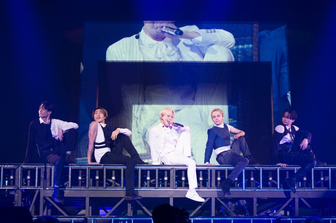 視線を一極集中させて魅せるブロック、ファンと一緒に楽しむシーンと、緩急に富んだエンターテイメント性溢れるステージで駆け抜けた前半。それを終えると、いつもの穏やかな表情でマイクを持ち、「本当にこの日を待っていました!」と挨拶したテミン。金髪も武道館用に染めたものと明かし、少しだけ照れたような表情を見せる。そして「次は絶対に皆さんの前で歌いたかった曲」と紹介した「Colours」。8月28日発売のミニアルバムに収録されるグルーヴ感たっぷりのダンスチューンは、客席も自然と笑顔に染めていった。