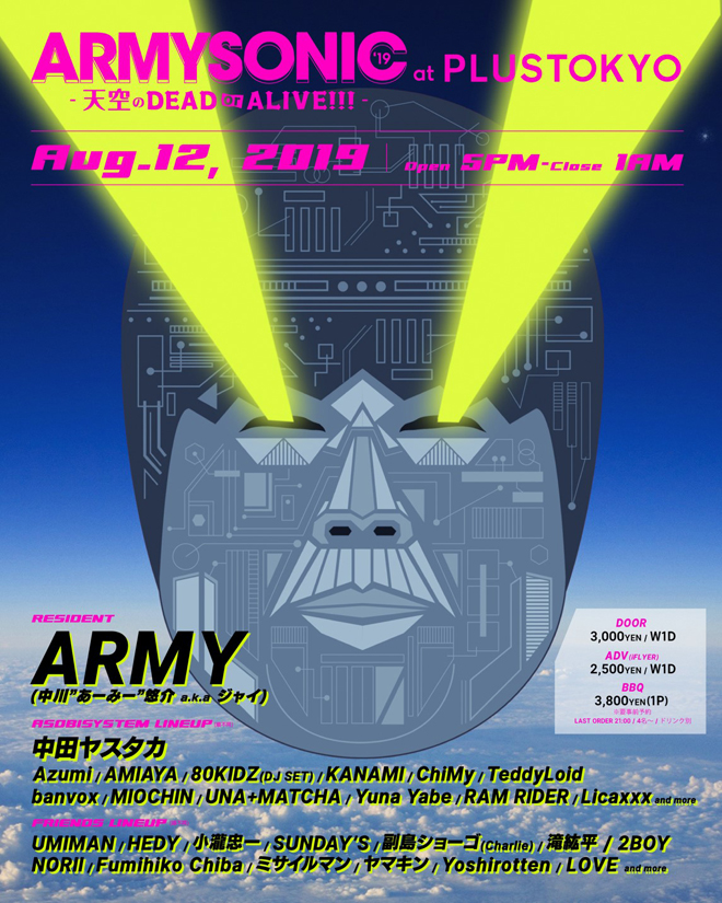 毎年恒例、もはや夏の風物詩と言っても過言でないナイトイベント<ARMY SONIC’19 -天空のDEAD or ALIVE!!!->が、8月12日(月)銀座 PLUSTOKYOで開催される。