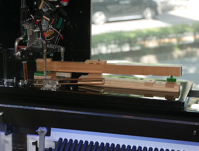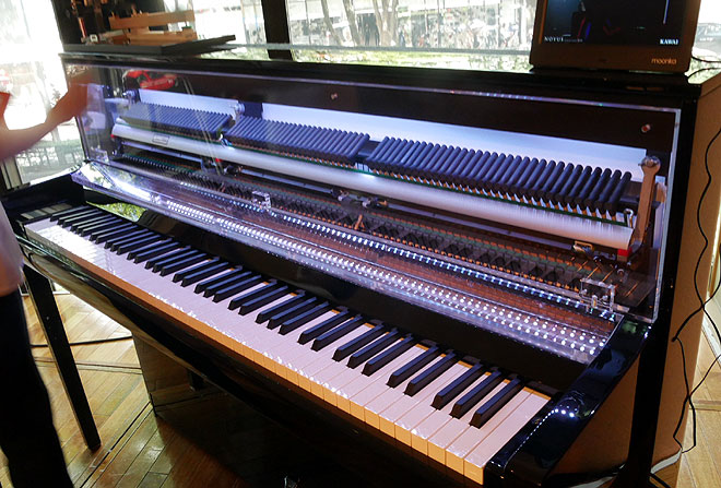 ▲こちらは内部の機構がわかるよう前面にクリアパネルを取り付けた展示用のモデル。上にある88鍵分のハンマーはすべて重さが異なる。