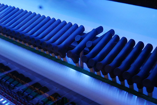 ▲アコースティックピアノのフェルトの代わりに、本器ではABS樹脂のハンマーを使用。88鍵分のハンマーそれぞれの動きを非接触型光センサーで検出して音を出す仕組みとなっている。