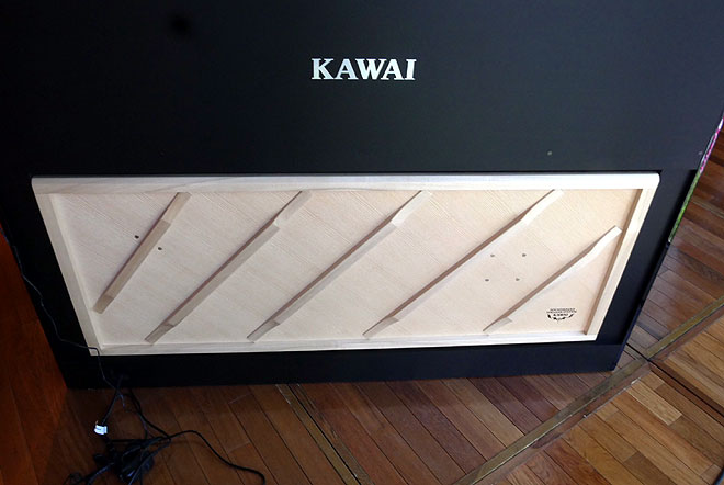 「NOVUS NV5」の本体背面には響板スピーカーを搭載し、本物のアコースティックピアノと同様に響板が響いて音が出る仕組みとなっているのが従来のデジタルピアノとの大きな違いだが、この点についても言及。「響板のおかげでアコースティックピアノと同じような響きを再現されてるんじゃないかなと感じました。また、弾いている時に、特に低音の深い響きを求めて打鍵した際に、ピアノから返ってくる振動を手に感じることができて、かなりアコースティックピアノに近いんじゃないかなと感じました。」