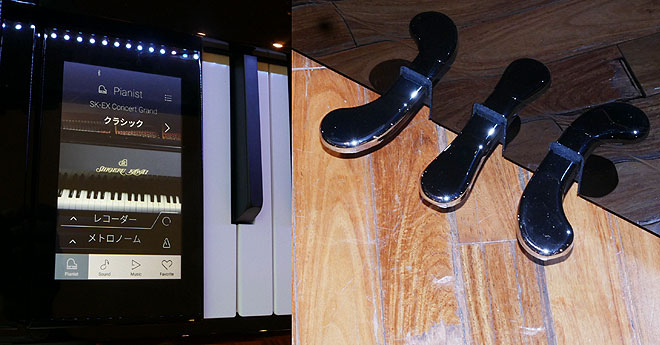 ▲鍵盤左にはスマホライクに操作できるタッチパネルを搭載(写真左)。ペダルはハーフペダル対応のダンパー、ソフト、ソステヌートの3本(写真右)。
