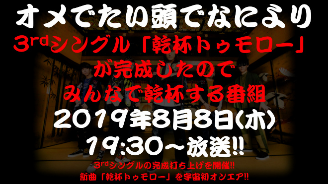 特番『3rdシングル「乾杯トゥモロー」が完成したのでみんなで乾杯する番組』では、新曲の制作秘話や、曲に込めた想いなどを話しながら、3rdシングル「乾杯トゥモロー」の解禁、ジャケット写真公開に加え、『オメでたい頭でなにより”1″マンツアー 〜今 いくね くるね〜2019.4.4@マイナビBLITZ赤坂』のライブ映像の放送などが予定されている。