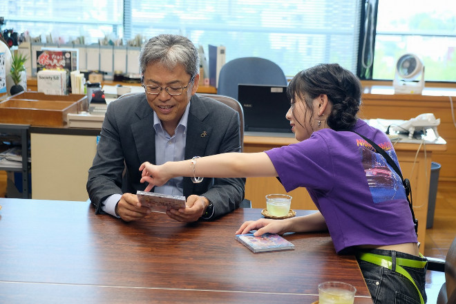 表敬訪問では磯田部長から、7月24日にリリースされたシングル「FRUSTRATION」についての感想とともに「選抜入りおめでとう!」と祝いの言葉が贈られた。