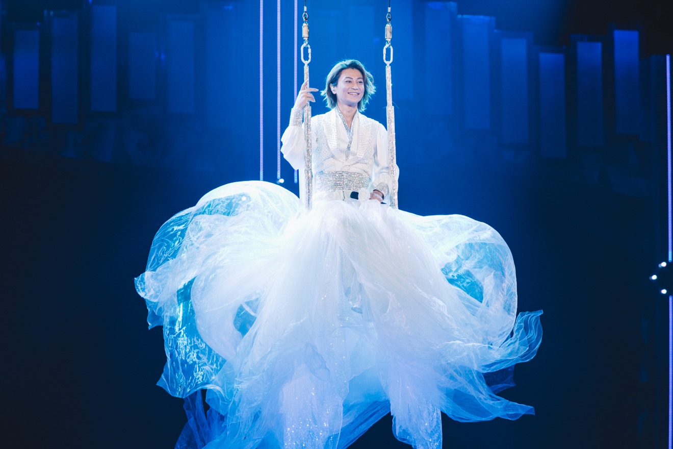 開演時刻を少し過ぎたころ、場内が暗転すると雷鳴が轟くなかダンサーたちが怪しげに舞う。迫力満点の映像が映され、スモークが立ち込める会場はまるでファンタジー映画やRPGゲームの世界にでもいるような荘厳な音楽が流れ、これから何が起こるのか…観客らはただ静かにその時を待っていた。そしてステージ奥にある大きな扉が開き、氷川きよしが登場! そのままステージから伸びる花道中央へ進むと、グリーンカラーに煌めく洋装に黄金色の登り龍を纏い、未発表曲「龍翔鳳舞」を披露。小節をきかせた雄々しい歌唱、優しくもしっかりと前を向いた歌詞を持つ楽曲だが、歌唱中もステージはどんどんと高さが上がり、なんとステージ上5mの高さに! 龍の尾をイメージしたドレスのトレーンは長さ20m近くあり、ひらひらと舞う様も優美で、タイトルをそのまま体現したステージに会場からは大きな拍手が届けられる。