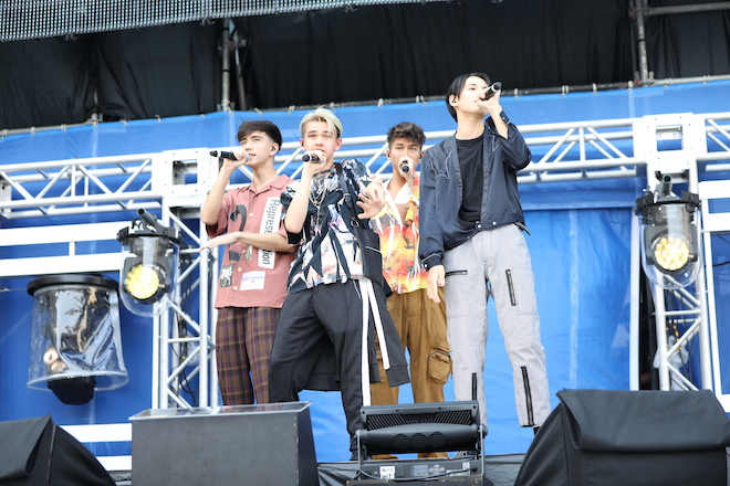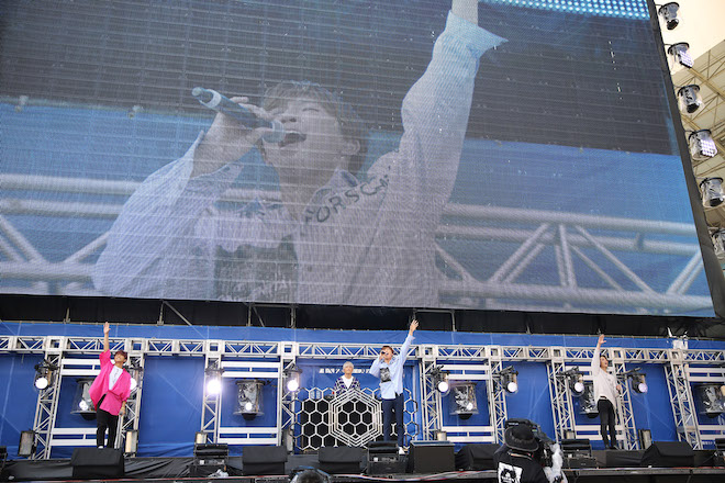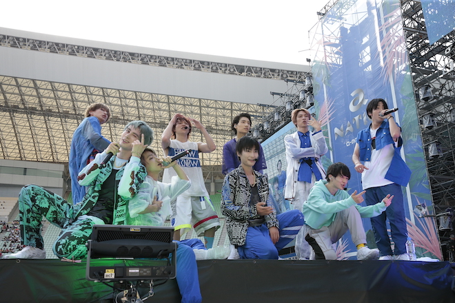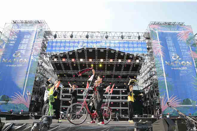 BOYS AND MENが「ボイメンが<a-nation>に来たぜ!」と高らかに宣言するや、お祭り感たっぷりのショーが開幕。自転車でヤンチャにステージ中を爆走したり、念入りなコール&レスポンスでの「まえのめりMinority」と、真夏の太陽よりも熱いアクトで席巻していった。