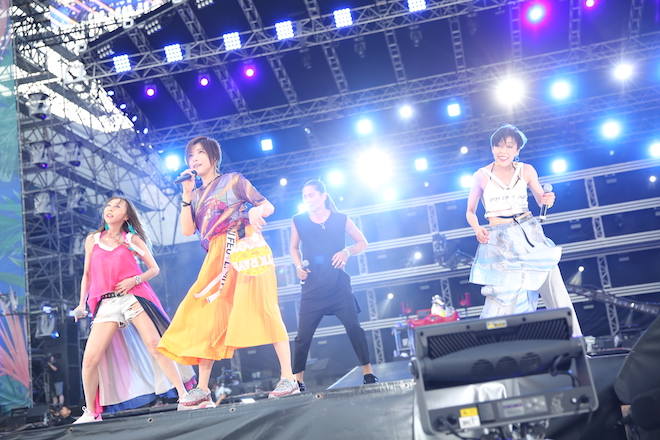 個性ある3声の重なりが心地よいシューティングアクト・THE BEAT GARDENでいよいよ折り返し地点。続いて93年のデビューから現在までダンス・レジェンドとして存在感を発揮するTRFがオン・ステージ。暑さもピークを迎えるなか、伸びやかなYU-KIの歌声が先導する「寒い夜だから…」などウィンターソングで紡ぐセットの爽快さたるや。 DJ KOOのクールネスなラップやSAMら華やかに舞うダンサーと、ひとつ欠けてもTRFではないステージングは、昨今のダンス・グループの礎を見るようだった。