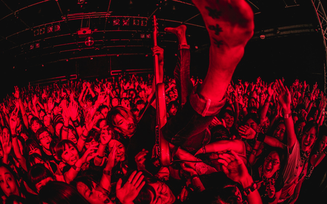 開放感があり、力のみなぎったビートに観客がノリ始めたタイミングで、来門「INORANがヤバいと思うヤツは手を上げろ!」と観客達を煽り、その後プレイされた、ヘヴィなギターリフとキャッチーなサビが魅力の「COWBOY PUNI-SHIT」で、会場の熱気はさらにヒートアップ。ツアータイトルにもなった「COWBOY PUNI-SHIT」は、ギタリストのMurataが作詞を担当しているが、そのオリジナリティ溢れるリリックの世界観に、INORANはとてもインスパイアされたそうだ。