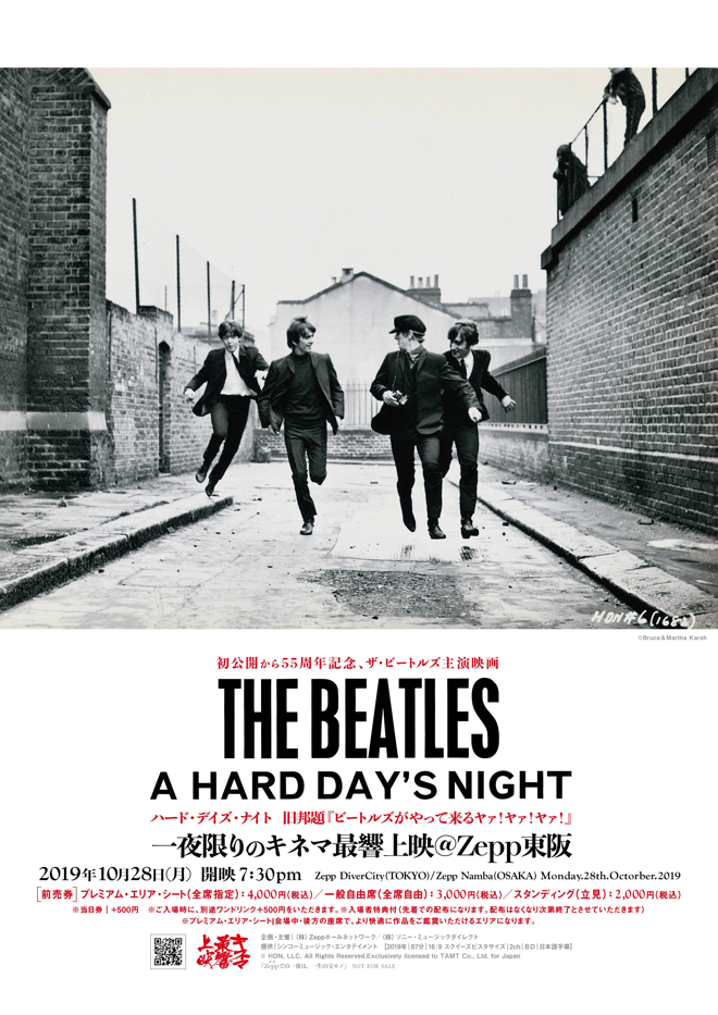 今回は<ザ・ビートルズ主演映画『ハード・デイズ・ナイト』一夜限りのキネマ最響上映@Zepp東阪>と銘打って、2019年の最新デジタル・リマスター版が東京・Zepp DiverCity(TOKYO)と大阪・Zepp Namba(OSAKA)の2会場で一夜限り上映される。チケットは本日8月28日(水)正午より、チケットぴあにて先行抽選受付(プレリザーブ)がスタートする。