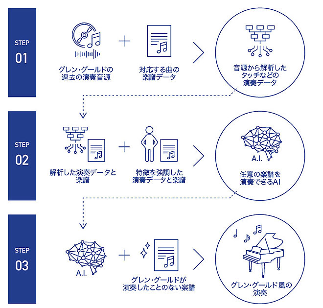 ▲AIシステムの学習フロー。グールドの録音に含まれるタッチの解析(STEP01)に加え、彼を熟知した演奏者らによる演奏データを使用することで、任意の楽譜をグールド風に演奏できる深層ニューラルネットワークを学習する(STEP02)。これにより、未収録曲もグレン・グールド風に演奏することが可能となる(STEP03)。