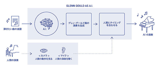 AI部分の開発にあたっては、彼らしい表現とは何かを追求するために、グレン・グールド・ファウンデーションの全面的な協力のもと、100時間を超えるグレン・グールドの演奏音源を解析し、得られたデータをもとに、深層学習技術を用いた。また、録音データのみならず、彼の演奏方法を熟知した複数のピアニストたちの演奏による「ヒューマン・インプット」もAIに学習させることで、かつてない再現度を実現した。