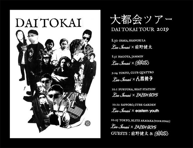 また、10月25日(金)にマイナビBLITZ赤坂で行われる<大都会ツアー>ファイナル公演(LEO IMAI x ZAZEN BOYS)に、前野健太と呂布カルマのゲスト出演が決定した。それに伴い、LEO今井と三栖一明が密室に籠って切り貼りし制作したという全出演者をコラージュした<大都会ツアー>の新ビジュアルも公開されている。