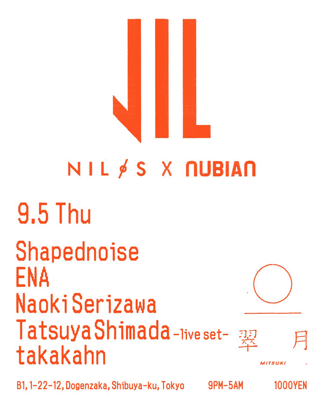 初日の9月5日(木)には、RYUZOがプロデュースし、アートディレクターYOSHIROTTEN(ヨシロットン)が内装デザインを手がけ話題となっている渋谷『翠月(ミツキ – MITSUKI)』でローンチパーティを開催。本イベントのために、ベルリンからシェイプドノイズが来日する。NumbersやOpal Tapesといったテクノレーベルから作品を排出し、エイフェックス・ツインもその才能を認める彼が、インダストリアルで実験的なサウンドを披露する。またNILOSサウンドレーベルの第一弾「SOIL / ENA」でコラボレーションした日本屈指のアーティストENAも参戦し、この2名によるスペシャルB2Bセットが本公演のみのエクスクルシーヴで披露される。さらにNYのアーティストコレクティヴCREW LOVEよりNAOKI SERIZAWAやTatsuya Shimadaやtakakahn なども出演する。