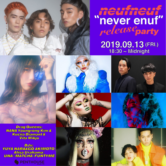 そして9月13日(金)の夜には、neufneuf初のイベント<neverenuf>を東京・神宮前SankeysPENTHOUSEにて開催する。HOLLANDとeillのスペシャルコラボライブや、韓国より招いた豪華ドラァグクイーンのショータイムなど通常のナイトイベントでは味わうことのできないダイバーシティーでエネルギッシュなリリースパーティとなる。開放的な異空間で魅せるキテレツな一夜を楽しんでほしい。