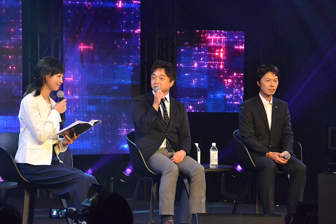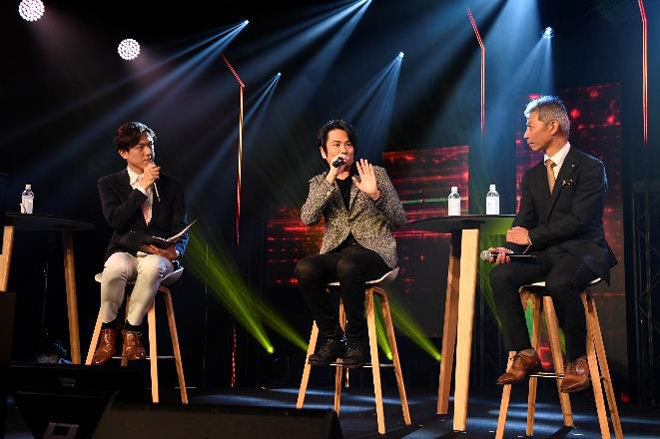 その後はテレビ東京「THE カラオケ★バトル」プロデューサーである柴幸伸氏と、第一興商 開発本部 商品開発部の橘聡氏が登壇し、「テレビとカラオケ」をテーマにトークショーを行った。柴氏は「“THE カラオケ★バトル”は2006年の放送開始当初からDAMを使用していて、2500人近い出場者の歌を支えていたのが第一興商のDAM。採点機能もどんどん高性能になって審査員の役割が変化していき、これまでは気軽に引き受けてくださっていた大御所歌手の方の中には、オファーを断られる方も(笑)」と笑いを交えながらコメント。番組放送時にはテレビのリモコンから参加する勝敗予想などを行なっているが「これからは生放送中のテレビと全国のカラオケボックスを連動させ、誰が高得点を獲得するかを競うのも面白いのでは」など、今後の可能性にも言及。橘氏もテレビやカラオケの進化、エンターテインメントのこれからについて触れ、「皆さんの想像を超えるものを提供し続けたい」と語っていた。