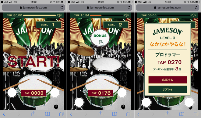 スマートフォンでキャンペーンサイトにアクセスいただき、オンラインゲーム「BEAT!BEAT!BEAT!」に挑戦。ドラマーになりきって制限時間(30秒)内にスネアドラムをできるだけ多くタップします。ゲーム参加者の中から抽選で、コラボバンド3組が出演するスペシャルライブのチケットをはじめ、コラボバンドのサイン入りフェンダー製エレクトリックギターや、 「ジェムソン」オリジナルグッズが当たります。タップ数が多いほどプレゼントの当選確率が上がり、期間中何度でもチャレンジ可能。
