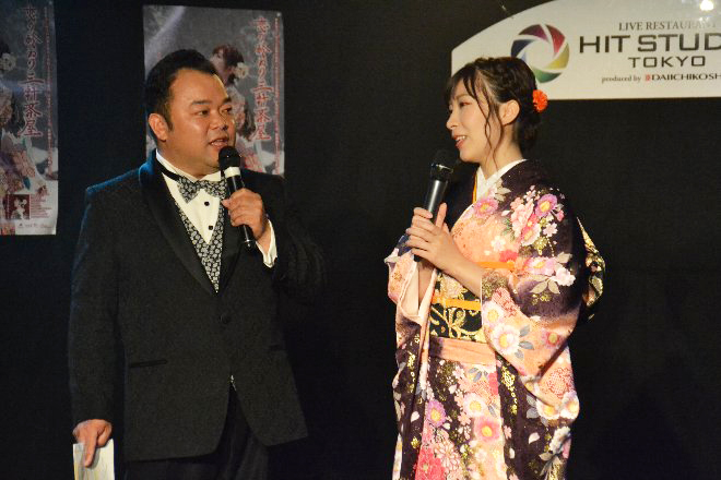 歌い終わると、客席を見まわした岩佐は、「みなさん、こんにちはー!岩佐美咲です!出来上がってますね!100点のお客さんです(笑)」と第一声。ピンクと紫を基調とした着物をクルッと回って披露する岩佐に黄色い声援が飛んだ。AKB48時代から数えると今年でデビュー11年目になる岩佐。最初の頃は芸能活動を楽しむ余裕がなかったものの、今は1つ1つ楽しめるようになったそうだ。2018年から「DAM CHANNEL 演歌」2代目ナビゲーターを1年間務めていた岩佐について、西寄が「わさみんは話が上手い!」と評すると、お客さんたちも「上手い!!」と絶賛の声が上がり、岩佐は「いやいやいや(笑)」と謙遜しつつ嬉しそうだ。