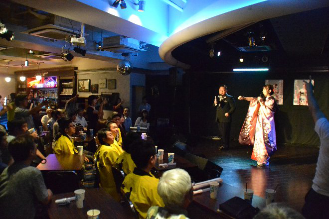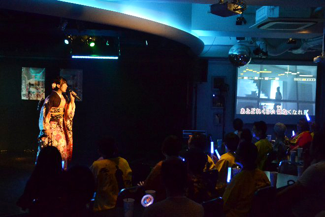このイベントは、全国のカラオケDAM設置店で岩佐美咲の最新曲「恋の終わり三軒茶屋」を歌い、抽選で選ばれたファンを招待して行われたもの。台風が近付いている中、熱心なファンが多数会場に集まった。開演前、司会の西寄ひがしが登場しておなじみの軽妙なトークで客席を温めると、お客さんの「わさみん!」(岩佐の愛称)コールに呼びこまれて岩佐美咲がステージに登場。1曲目に歌うのは、デビュー曲「無人駅」だ。胸に手を当てながら、切なげに歌い上げる岩佐。最前列では、「岩佐美咲ファンクラブ」と描かれた黄色い法被を着たファンがズラリと並び、ペンライトを振りながら声援を送る。