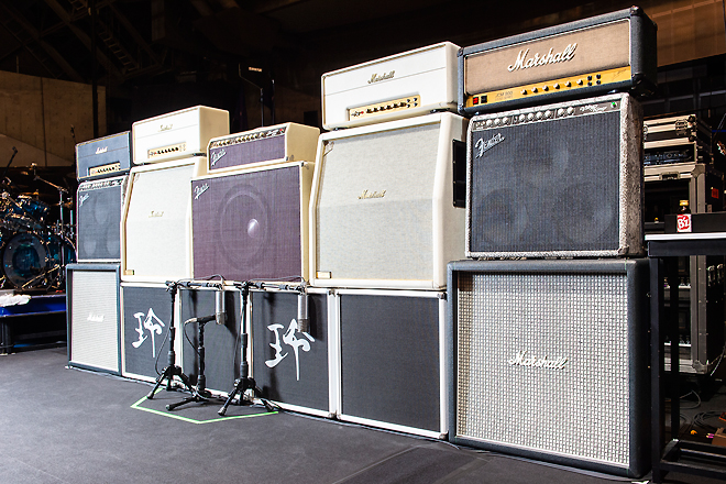 これまでのツアーでは、ギターテックチームFATが開発したFAT 80/84の3段積み×8台によるアンプの壁が築かれていたステージ上だが、<B’z LIVE-GYM 2019 -Whole Lotta NEW LOVE->では「いろんなアンプを置きたい」という松本孝弘のリクエストから新たなものに。松本孝弘の所有アンプをリハーサルで用意し、さまざまなレイアウトを試して決定したとのこと。