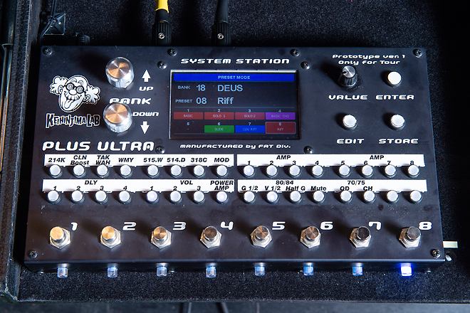 今回のツアーから新導入されたKEIHINJIMA LAB MANUFACTURED by FATDiv.によるシステムステーションPLUS ULTRAが、集中コントローラーシステムとなるもの。32のコントロールが可能で、タッチパネルは曲名表示やプリセットごとに色を変えることもできる。昨年の<B’z LIVE-GYM Pleasure 2018 -HINOTORI->で試験的に採用、今回のツアーより松本孝弘のシステムに合わせたカスタムが施されている。