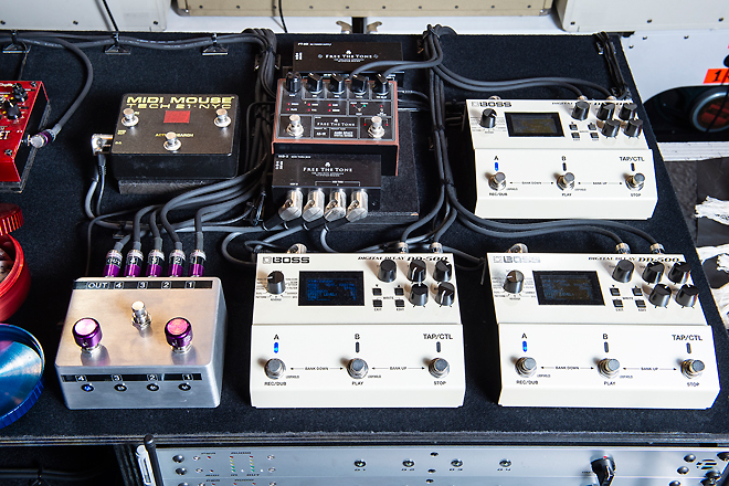 アンプヘッドが収納されたラック上部にはコンパクトエフェクター類をセット。上写真の上段右から時計回りに、BOSSのデジタルディレイDD-500が3台。これら3台はソロ用、深いディレイ用、ディレイにオクターブ成分を混ぜたサウンド用など1曲のうちに3つのディレイが必要となることもあるため。その隣がFATのラインセレクター、テック21 MIDI MOUSE(ディレイテンポを制御)、フリーザトーンのAMBIスペースデジタルリバーブAS-1R、フリーザトーンのミディスルーボックスMB-3とDCパワーサプライPT-3Dをセット。