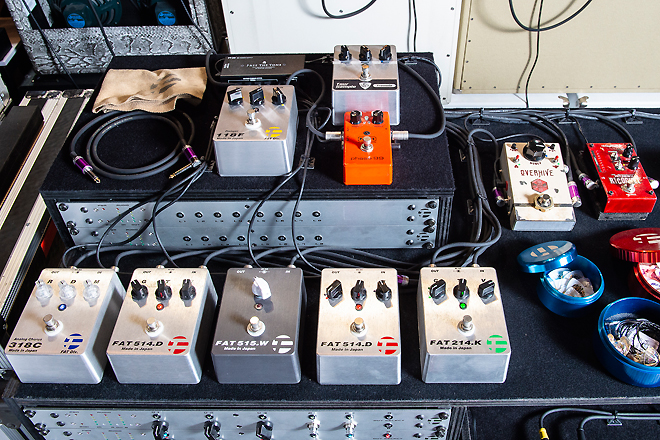 上の写真右列の2台のFAT 80/84は歪み用。上段がバッキング用で下段はソロ用となる。左列の2台が主にクリーンで使用するFAT 70/75。フレーズによってEQを調整しつつ、上下の2台を使い分けている。なお、一番左の3台のアンプヘッド(上からFAT 70/75、FAT 80/84、FAT 70/75)が収納されたラックはバックアップ用。