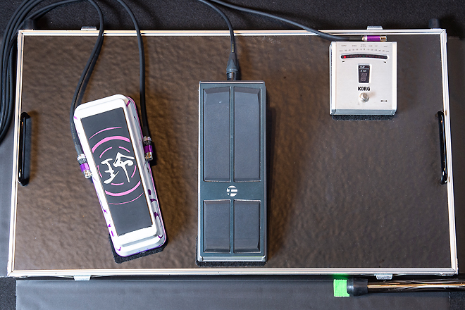 ステージ上の足元には左から、ジムダンロップ製TM95 / TAK CRY BABY、FATがカスタマイズしたBOSS製ボリュームペダルFV-500L、コルグのチューナーDT-10をセット。