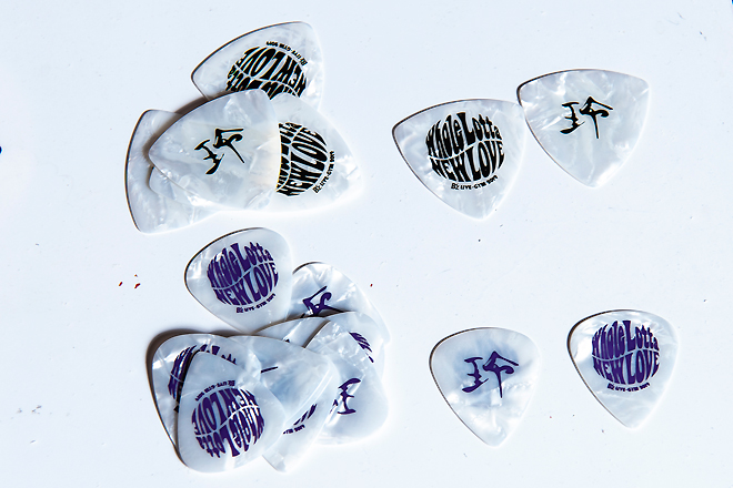 ティアドロップ型ピックは“Whole Lotta NEW LOVE”ロゴや“玲”ロゴがプリントされたエレキギター用。一方のセルロイド製オニギリ型ピックはアコースティックギター用。