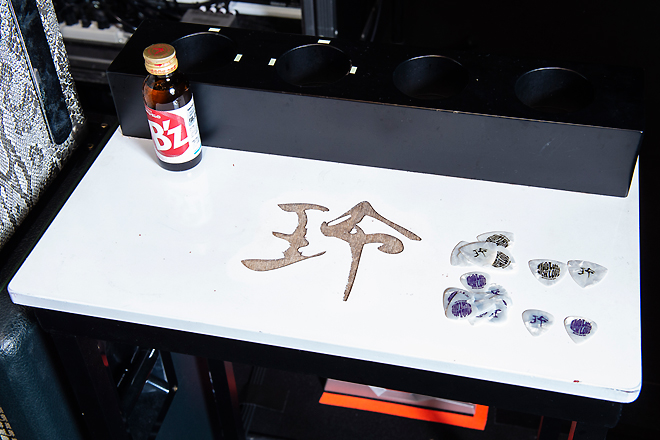 ギタープレイの邪魔にならないよう湾曲したスタンドには“玲”の印とトライバルの模様。「デウス」等で使用したスライドバーもセット。