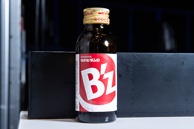 スピーカー脇には“玲”の印が彫り込まれたテーブルが。その上部はドリンクホルダー。B’z仕様のリポビタンDも。