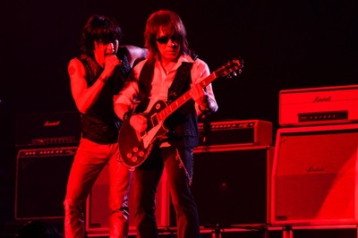 写真右は「裸足の女神」のギターソロ最後に稲葉浩志が松本孝弘に手渡す電気ドリル。ドリルのモーターノイズをギターのピックアップが拾ってサウンド出力する。