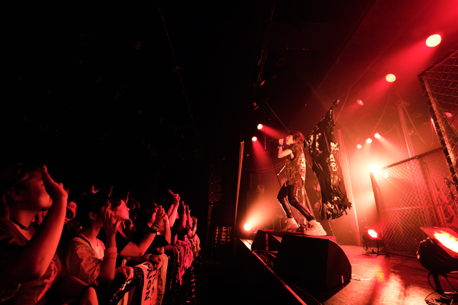 第1部がスタートすると、ステージを覆っていた幕がオープン。目の前には天井から垂れ下がったチェーンやコイルがズラリ。サポートメンバーの前には金網の柵が置かれるなど、いつものリキッドとはかけ離れたステージの装飾にまずは圧倒され、フロアからは感嘆の声があがる。大きなフラッグを背負い、ワイルドな振る舞いで登場したSHINは、ビッグサイズのTシャツの袖を切ったノースリーブ姿。メンバーを含め、全員が黒づくめ。ライブは「4444」で勢いよく幕開け。ライブで鍛え上げた破壊力満点のギターサウンドが満場のフロアに響き渡る。
