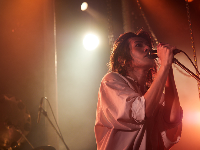 金網がなくなったステージに最初に登場したのは、真っ白いブラウスに着替えたSHIN。1部とは真逆の明るい照明がSHINを照らすと、白いブラウスに、気品漂う端正なルックスが映える。そうしてバックバンドがいないなか、静かに「AZALEA」を歌い出す。懐かしい記憶を蘇らせるような幻想的なメロディにのせた日本語詞を、さっきまでステージに立ってたSHINとは別人のようにミックスボイスを使った美しい歌声で、情感たっぷりに歌う姿に観客たちは笑顔を浮かべながら陶酔していく。華麗な立ち振る舞い、柔らかに動く指先、1部とは唱法から音楽性、照明からステージングまでもが対照的だ。
