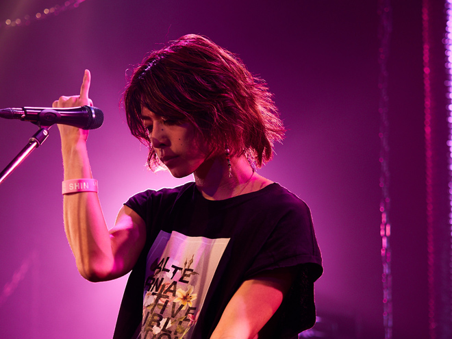 タオル回しが沸き起こった「6inchの凶器」からの後半戦は、再びロックモードへシフト。「俺は普段道を歩くときはずっと下向いてる。それぐらい人見知りなんだ。でも、みんなの前だと自分をさらけ出せる。だから、お前らもさらけ出してくれー!」──SHINのエモーショナルなMCが熱いコール&レスポンスを呼び起こし、そこに希望感をたっぷり含んだ「just going true side」を勢いよくぶちまけてみんなを笑顔にしたあと、最後に「花」を歌い届けて2部は終了。「歌い続けられる限り、歌いたいと思います」といってSHINはステージを後にした。