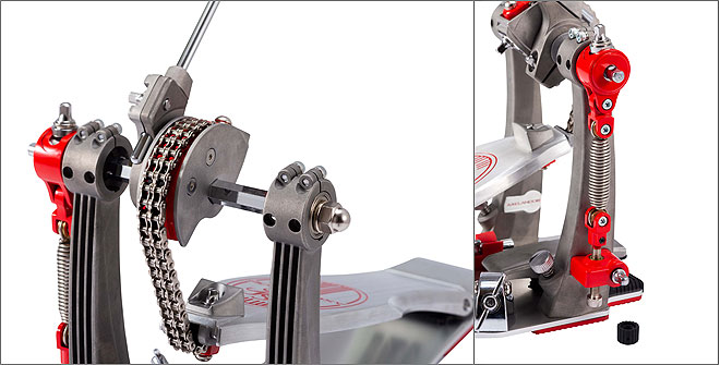 ワンアクションで調整できるテンション・スプリング機構も大きな特徴。独自の機構により、付属のドラムキー、もしくはノブキャップでカンタンに調整可能。キーボルトを回すだけで、テンションを強めたり、弱めたり、スムーズな微調整も行える。緩み防止用のロックナットなどは必要なく、ドラムキーを使用することで、指先を痛めずに少ない力でお好みのテンションにカンタンに調整できるようになっている。また、ヒール部分は着脱式で、ショートからロングまでフットボードの調節が可能に。ヒールアップ奏法やヒールダウン奏法などもパーフェクトに対応する。