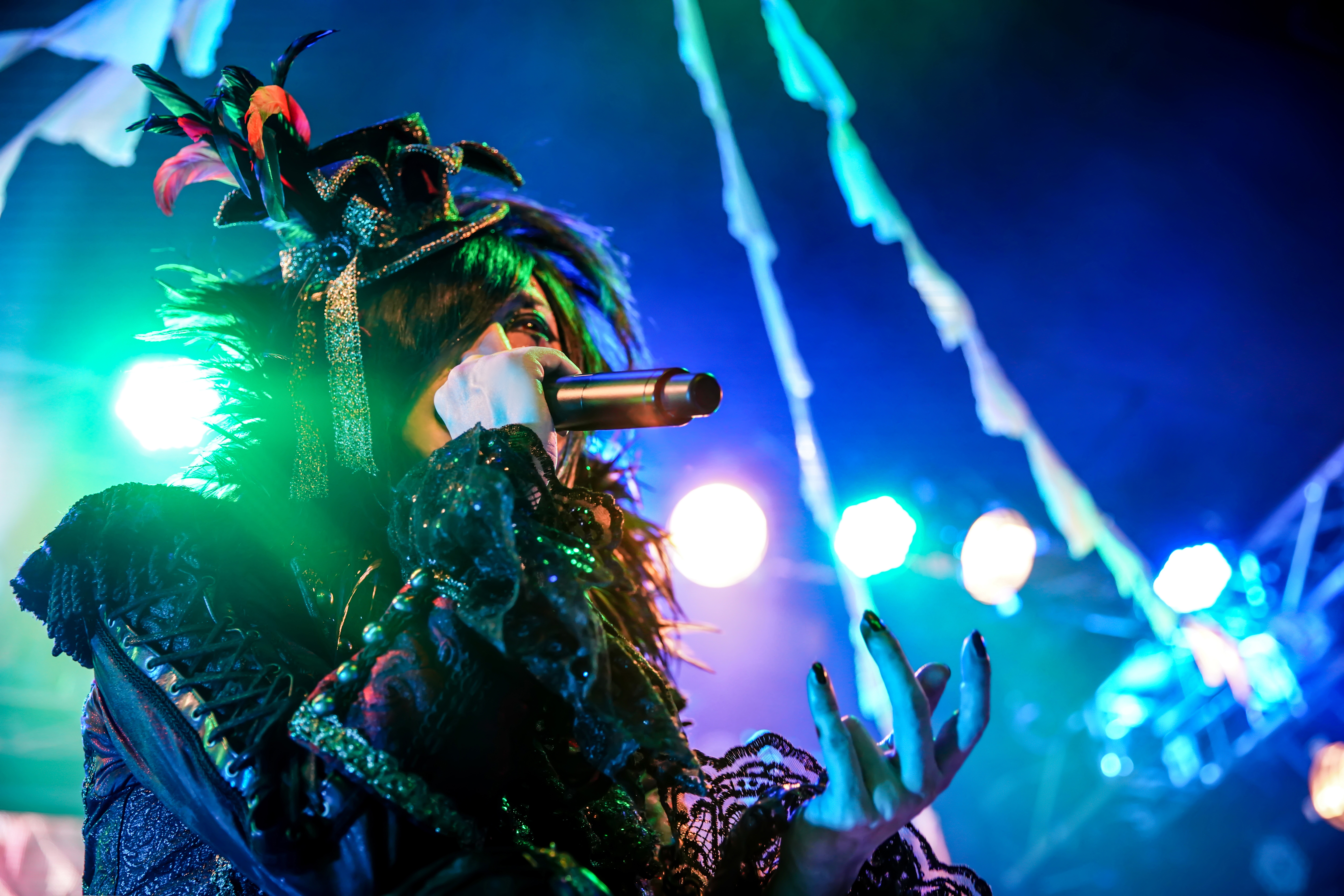 「真夏の夜は、妖精と人間を繋ぐ扉が開くという……。さあ、共に真夏の夜の夢を見よう」と始まった「Dark fairy tale」、雄々しきASAGIのオペラヴォイスを合図に飛び出す「Who killed fairy?」。観客たちは牙を剥いた荒々しい演奏へ触発されていく。一転、それまでの熱狂を闇の中へ呑み込むようにDは「知られざる子供達」を演奏。ゆったりとした歌声と演奏に心が惑わされる。