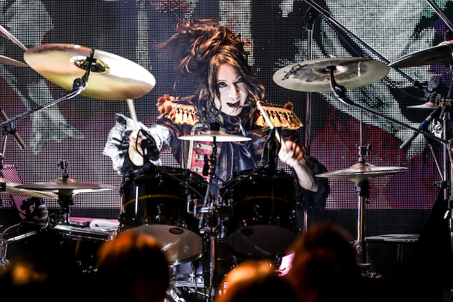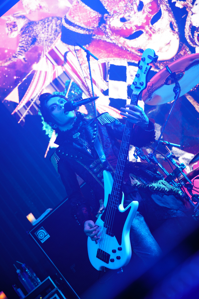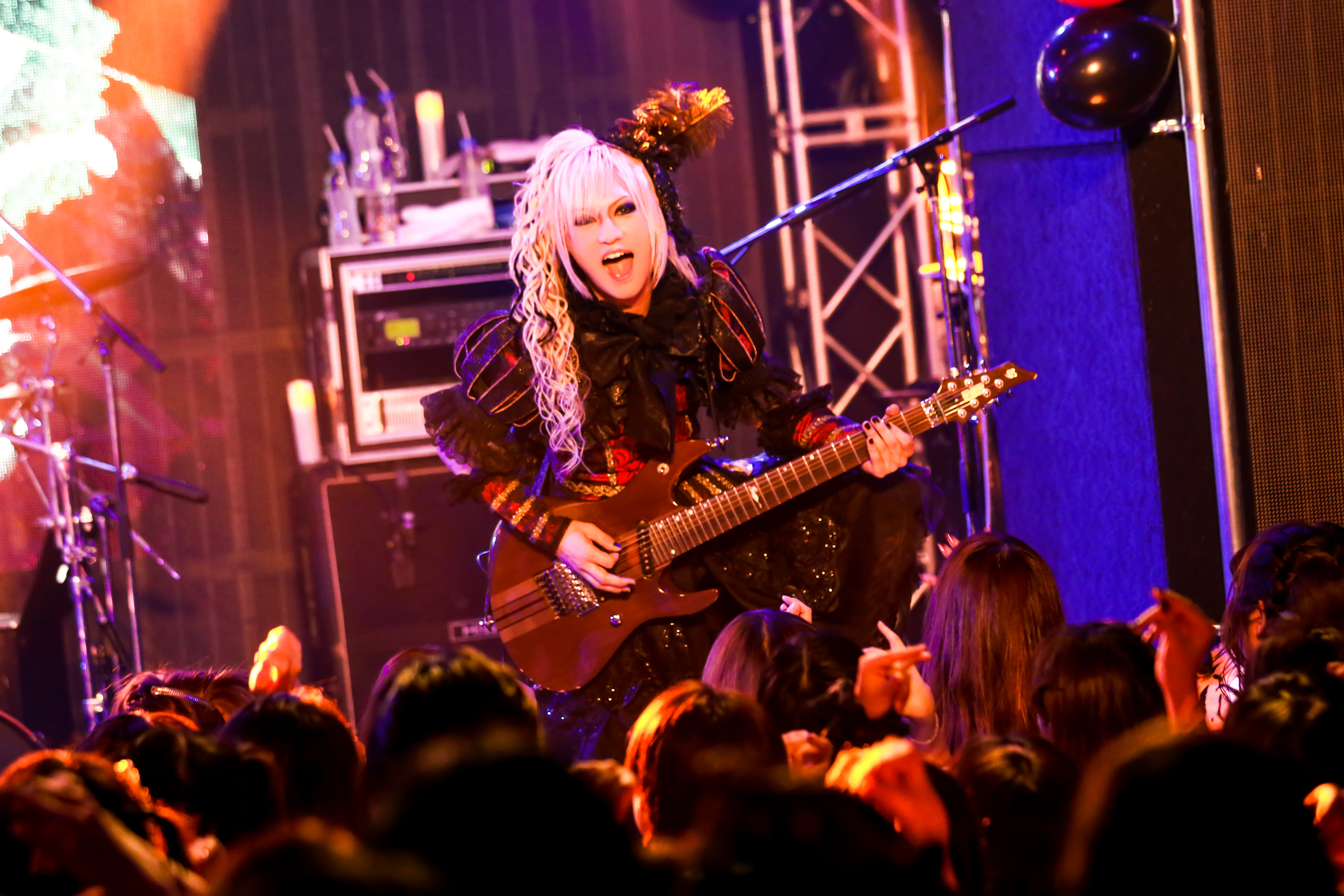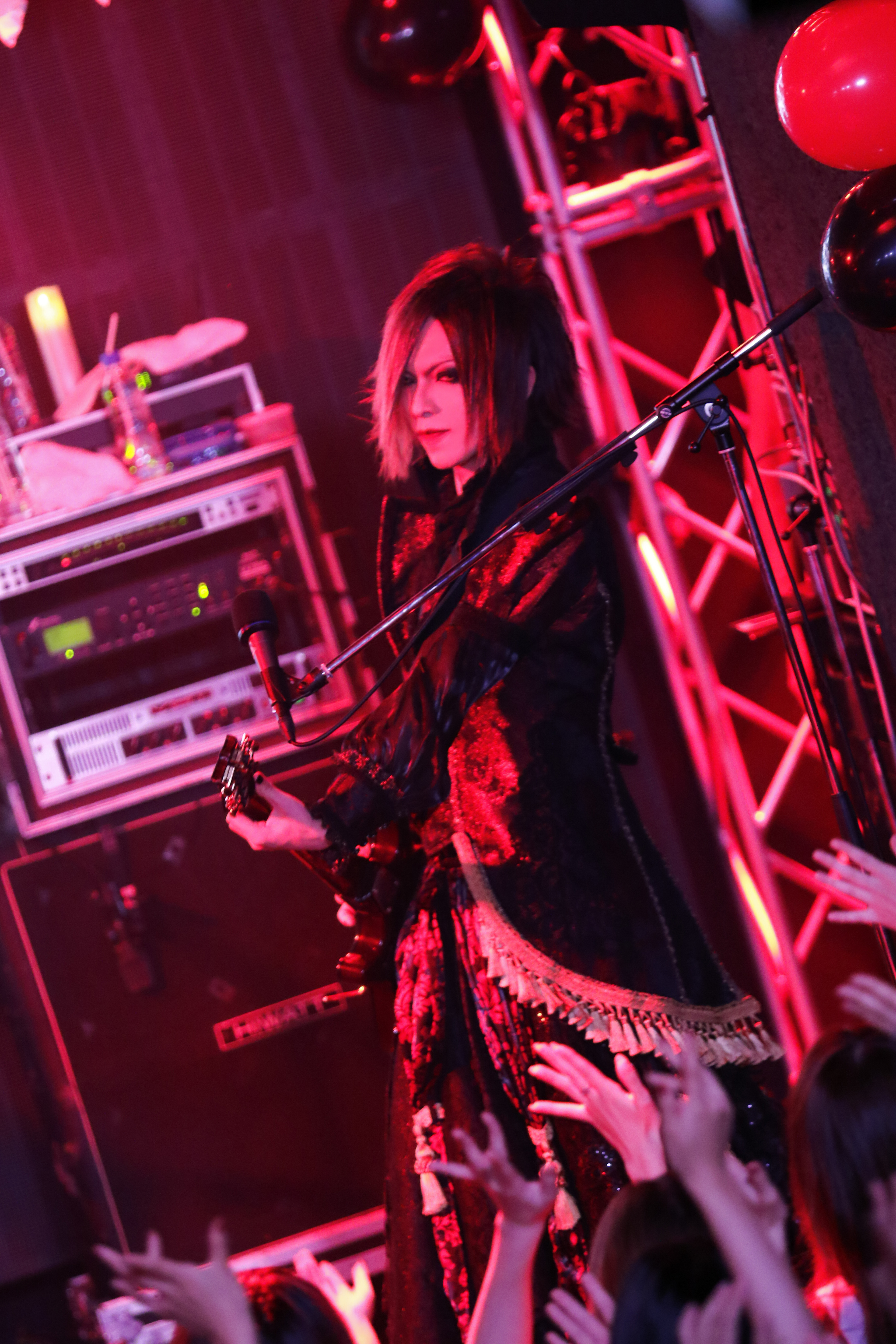 HIROKI(Dr)によるソロコーナーでは、シンフォニックな音色を背景に攻撃的な演奏が披露される。その荒ぶる演奏へ導かれ、メンバーたちも舞台へ。4人は、幻想耽美な香りと荒々しさを混濁させた「アンフィテアトルムはクロワッサンの夜に」を披露。各自のソロプレイも組み込みながら、彼らは「闇のサーカス」というテーマに似合う妖艶で激情した演奏を突きつけ、観客たちを煽り続けてゆく。
