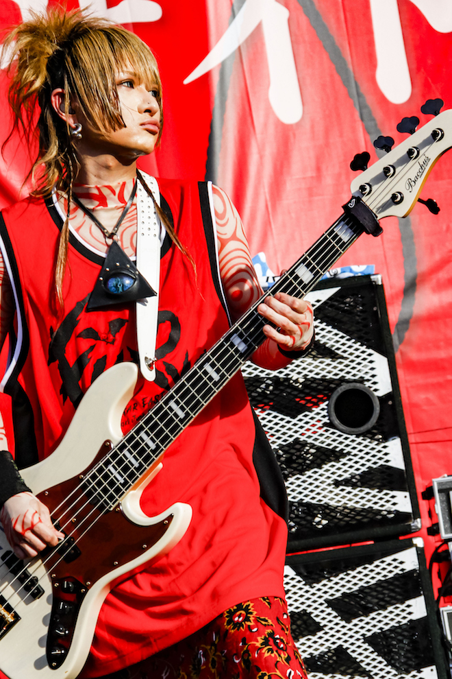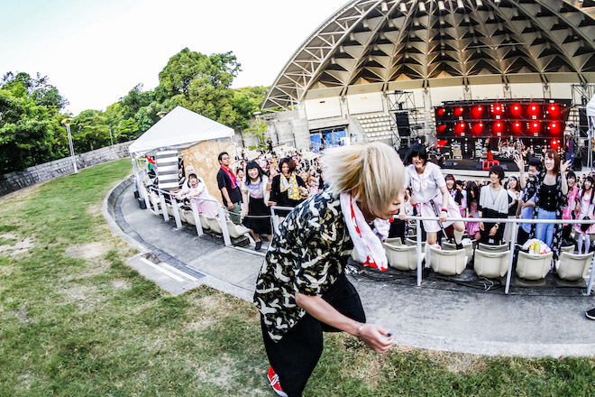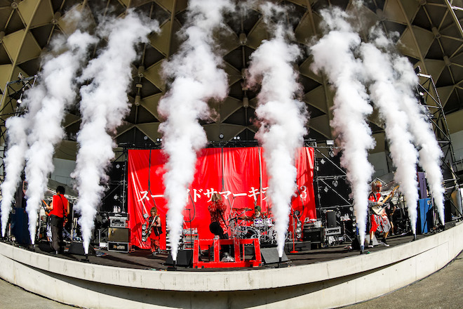人間の平均体温よりも熱い気候の中で「頭いこうか!」という無謀な掛け声に、客席はひるむことなく頭を振ったり拳をあげたりと忙しく動いていく。そのまま、「ジャパニーズクラッシャー」へ入るとCO2の柱が白い煙と共に勢いよく噴出していった。と同時に、ステージ前方へと迫り出しギターを弾くZ(G)と楓(G)。暑さをもろともしない表情で巧みに演奏する姿に客席からは歓声が上がる。曲が終わって即座に「暑ぅ……」と溜め息まじりに呟いたマモ。だが、休息を挟むことなく「ギラつく太陽」へと場面を変えていった。ここでは、テーマパークの水かけパレードを思い起こさせるかのごとく、客席に向かってステージ両サイドに置かれたキャノン砲から水しぶきが放たれた。このウォーターキャノンという演出は野外でしかできない特別なもの。それだけに、楽曲自体、ライヴハウスで聴くとき以上に開放的な感じが見られた。