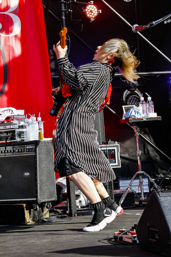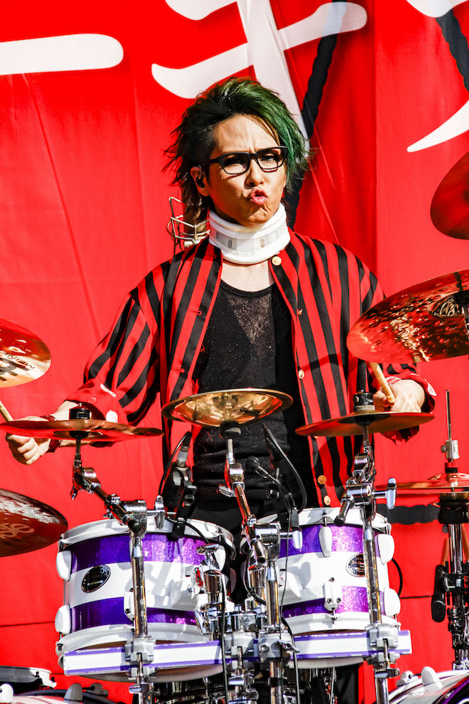 「じゃあ、夏ということで涼しめの曲をやりたいと思います!」そんな前振りがあっただけに、次の曲は落ち着いて聴けるのではないだろうかと場内にいる誰もが思った。だが、安堵を感じた数秒後に始まったのは、「毒盛る」。涼しくなるどころか息ができなるほどの暑さを感じる曲に、客席のボルテージは最高潮に。そのあとは「EROGRO」と「アポカリプティックサウンド」を。ここで注目したのは七星(B)と宏崇(Dr)、リズム隊の演奏だ。この曲に限ったことではないが、こうした高温多湿の中でも潰れることなく伸びやかに広がっている演奏力を目の当たりにすると、どんな環境でも大丈夫といえるほどの音を作り出せていることがわかる。