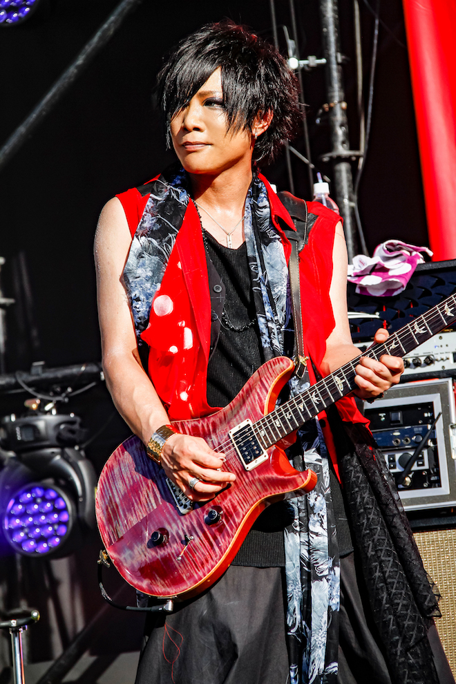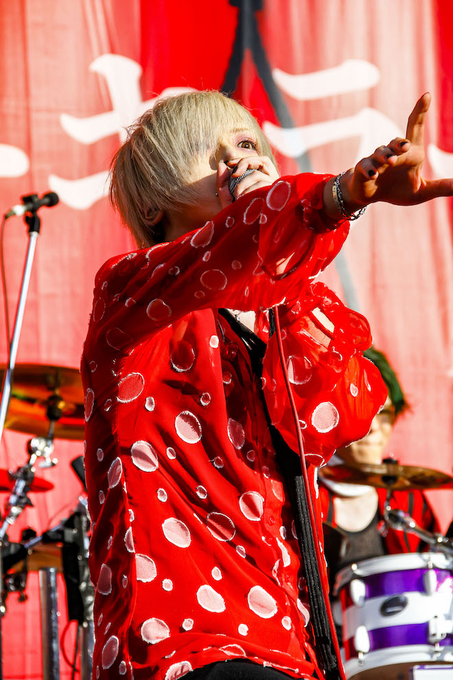 16時半、日が沈む気配が一向に感じられない状態のままライヴはスタートした。通常であれば室内でのライヴゆえに場内が薄暗い中でメンバーがステージ上に姿を現すのだが、今回は野外ライヴというだけに辺り一体が明るい中での登場というのも実に新鮮だ。赤い衣装で統一した5人が出てくると、首吊り縄が描かれたバックドロップ幕が少しの風でゆらりと揺れる。それはまるでこれから始まる惨事の様子を示唆しているかのようにも見えた。マモ(Vo)が「楽しもうぜ、大阪!」と高らかに告げると、1曲目の「シンクロ」が勢いよく演奏されていった。