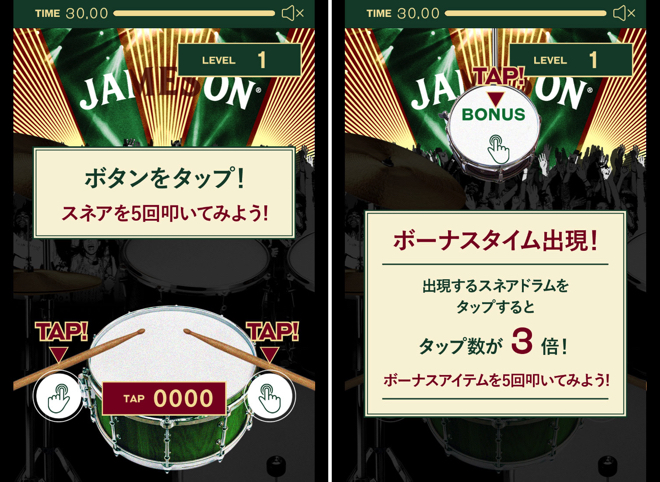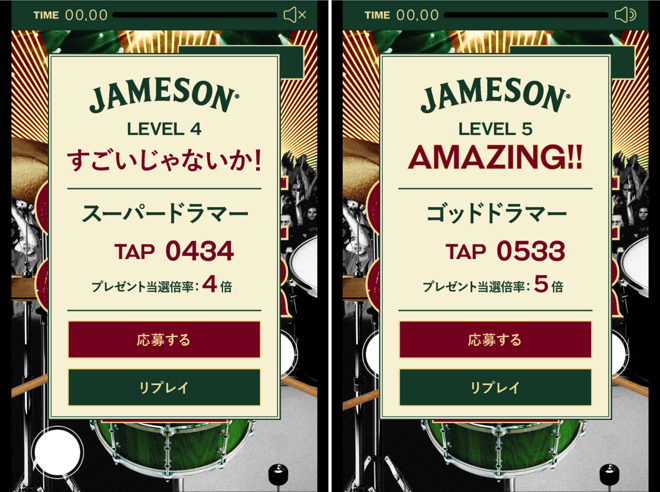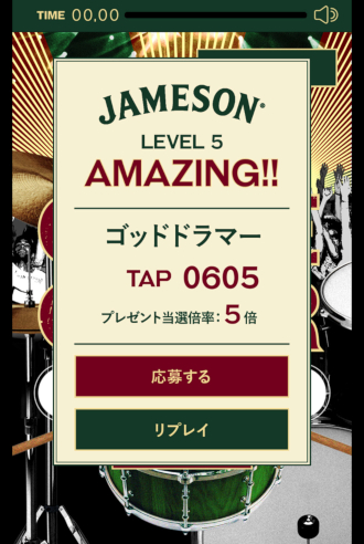 ルールはシンプル。画面に表示されるスネアを30秒でどれだけタップできるかというものだ。ゲームをクリアすればプレゼントに応募できるが、ご覧の通りスコアが高ければ高いほど当選確率はアップする。これは最高倍率の5倍を狙うしかないだろう。