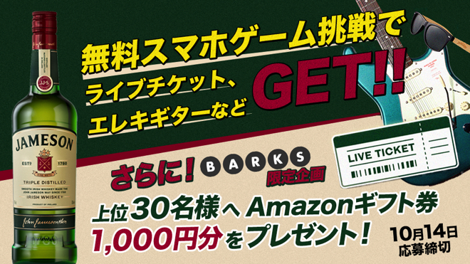 特設サイトで公開されているオンラインスマホゲーム「BEAT!BEAT!BEAT!」に参加した方から、抽選で100組200名にこの音楽イベントのライブチケットが当たるのだが、チケットの他にもコラボバンドのサイン入りフェンダー製エレキギターや「ジェムソン」オリジナルグッズが当たるチャンスがあり、音楽ファンには嬉しい企画となっている。