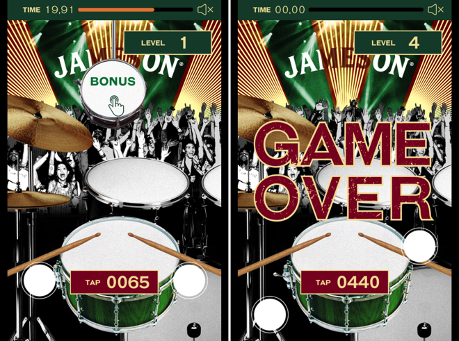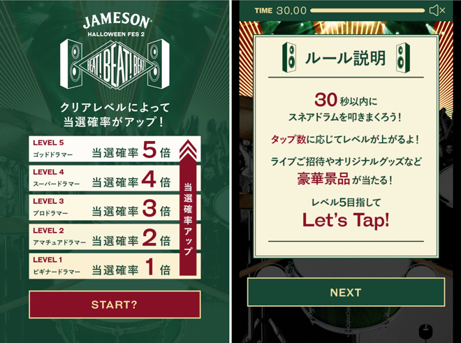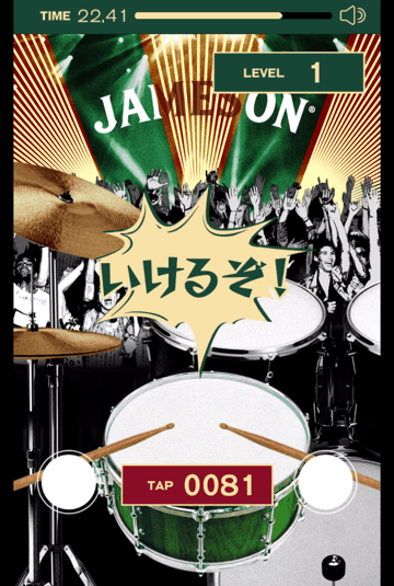 スマートフォンでキャンペーンサイトにアクセスいただき、オンラインゲーム「BEAT!BEAT!BEAT!」に挑戦。ドラマーになりきって制限時間(30秒)内にスネアドラムをできるだけ多くタップします。ゲーム参加者の中から抽選で、コラボバンド3組が出演するスペシャルライブのチケットをはじめ、コラボバンドのサイン入りフェンダー製エレクトリックギターや、 「ジェムソン」オリジナルグッズが当たります。タップ数が多いほどプレゼントの当選確率が上がり、期間中何度でもチャレンジ可能。