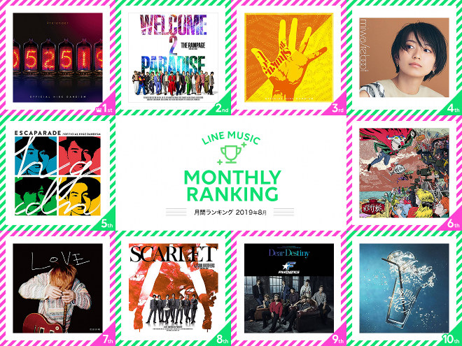 LINE MUSICが2019年8月の月間ランキングを発表、 人気楽曲100曲を集めたプレイリストを公開した。(集計期間:8月1日~8月31日)