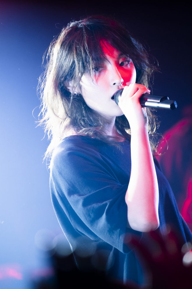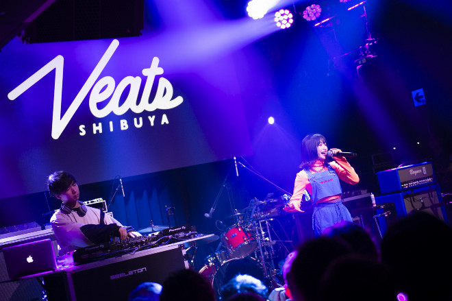 記念すべきオープニングアクトを務めたのはティーンのカリスマ、吉田凜音。彼女と同年齢である19歳のDJ yakkleをバックに従え、自己紹介を込めたラップソング「Ride On Turtle」からレイドバックしたグルーヴのモダンなシティポップ「サイダー」、おもちゃ箱をひっくり返したようなキュートなトラックの「KITTY」を立て続けにドロップ。ここで、「Veats Shibuya、オープンおめでとうございます」とあいさつ。「私が初めてこのステージに立った、記念すべき人間になったので嬉しいです」と語ると、オールドスクールマナーのラップソング「パーティーアップ」ではオーディエンスのコール&レスポンスを巻き起こし、可愛くも毒っ気のある強烈な個性をしっかりとアピールした。