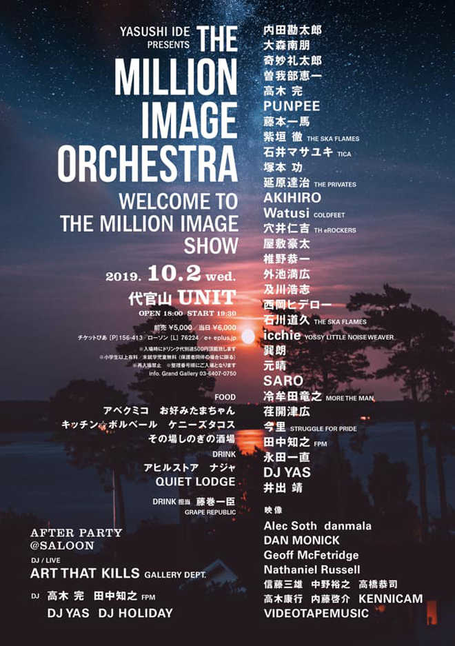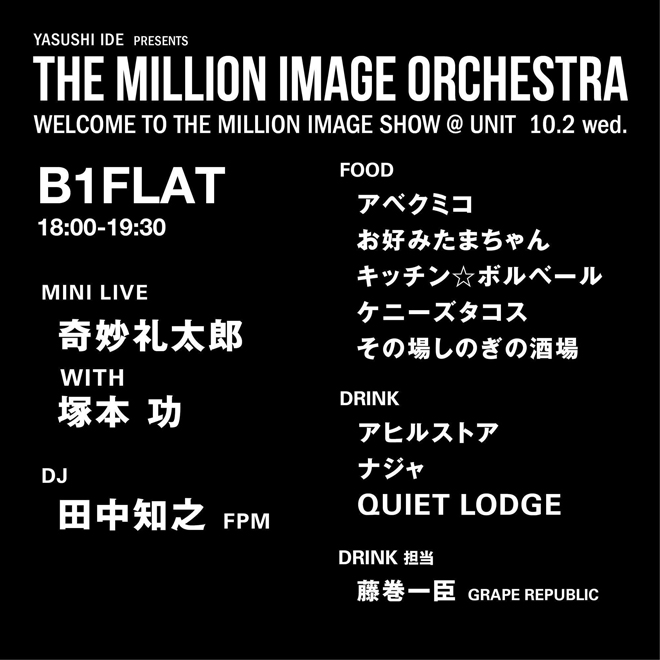 井出靖率いる総勢25人を越える話題のドリーム・バンド「THE MILLION IMAGE ORCHESTRA」のライブ<WELCOME TO THE MILLION IMAGE SHOW>が10月2日代官山UNITで開催される。