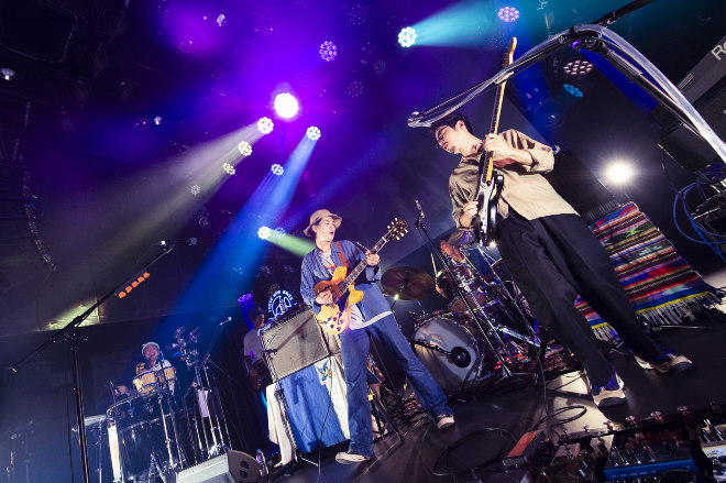 続いて、ステージ上に設置されたバンドのネオンサインが光り、Yogee New Wavesのメンバーがゆったりとした歩みで登場。トロピカルなムードのラヴァーズロック「Megumi no Amen」でライブは始まった。満面の笑顔で“楽しいことやるのさ、なぁ兄弟!”と呼びかけると、観客からは「Yeah!」という声がそこかしこから上がり、ライブ人気の高い「Summer」ではラテンからルーズへと自由自在にビートを変えながら、観客の心と体をリラックス&スロウダウンさせた。