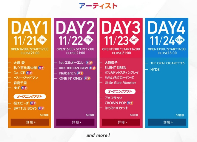 今回の発表では、11月21日(木)に私立恵比寿中学、Da-iCE、ゆず、桜エビ~ず(オープニングアクト)、BATTLE BOYS(オープニングアクト)、22日(金)にlol-エルオーエル-、KICK THE CAN CREW、Nulbarich、ONE N’ ONLY、23日(土)にCROWN POP(オープニングアクト)が出演することが明らかになった。